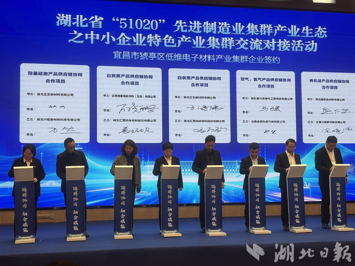 当天,在活动现场宜昌市猇亭区低维电子材料、荆门市掇刀区新能源动力电池等5家国家级产业集群现场发布了集群高质量发展实施方案、产业链图谱及供需清单,为推动集群治理及产业链上下游精准对接、协同发展提供了清晰路径。5个集群内25对上下游企业现场签署供需合作协议,签约金额达7.16亿元,进一步提升了重点产业链的本地配套率与协同水平。