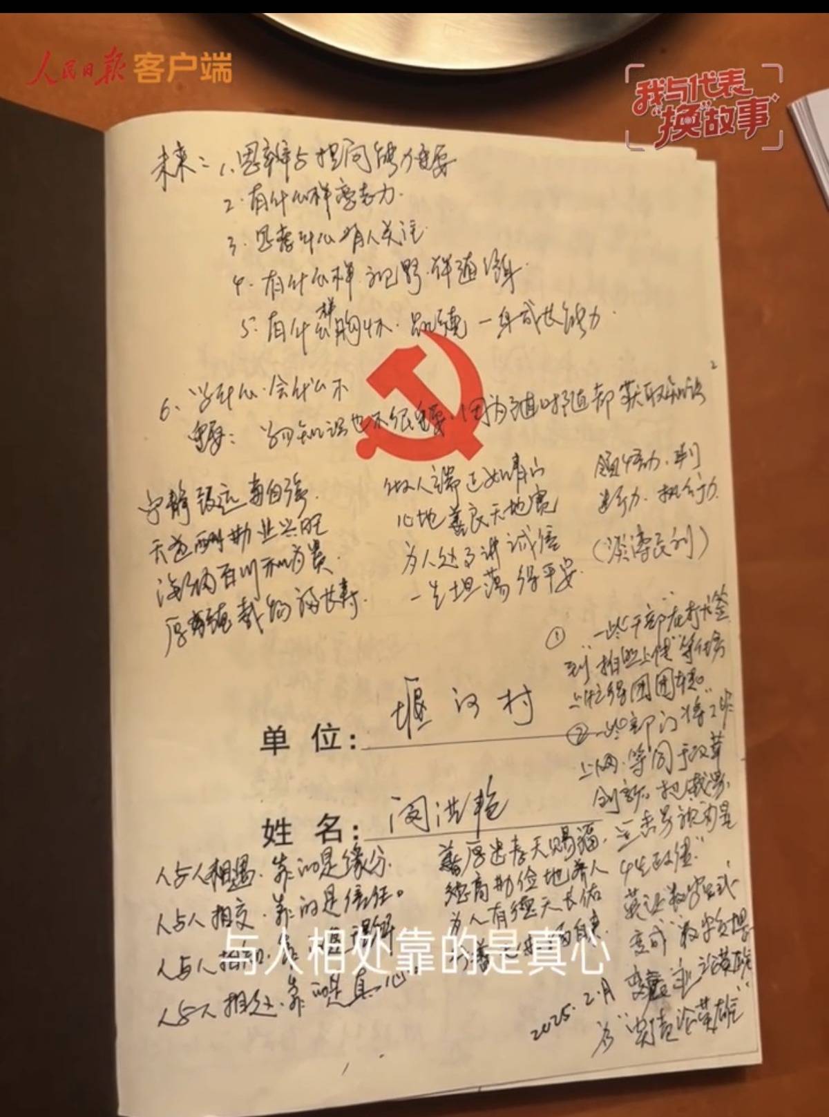 这些笔记本里,有履职中形成的建议,有村里的大小事务,有乡亲们的热切期盼,也记录着过去的苦日子、现在的好日子。闵洪艳还会把悟出的心得写在本子上激励自己:“共产党员就要敢担当、真干事。”“一村富不是富,村村富才算富。”“与人相处,靠的是真心。”“做人端正如青山,心地善良天地宽;为人处世讲诚信,一生坦荡得平安。”