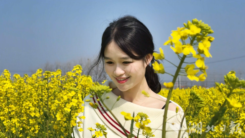 汉川市湾潭乡政府工作人员李奥丽:“前两天,西江乡的油菜花上央视了。现在我们湾潭的万亩花海也盛开了。今天,我为湾潭代言,大家看,美不美?”