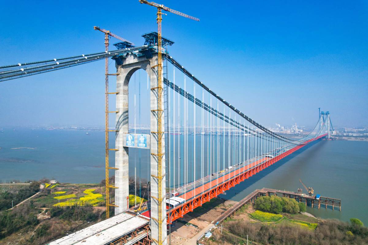湖北日报讯 (记者戴辉、通讯员陈欣雨、叶喆、周鑫)主桥钢桥面铺装作业正酣,抛丸机、喷涂机等设备往来穿梭,千余名建设者争分夺秒……3月13日,横跨鄂州和黄冈的燕矶长江大桥建设现场热潮涌动。