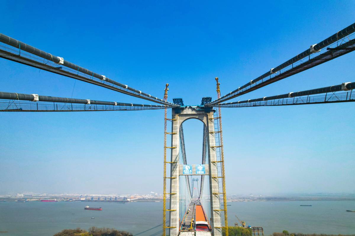 “大年初七就赶回来了,大家都积极投入工作。”主桥产业工人常江鹏说。节后复工以来,燕矶长江大桥建设全面按下“快进键”。目前,各工点作业面全面铺开,人员机械全部到位,项目建设满弦开弓,掀起大干快上热潮。作为世界首座不同垂度四主缆双层钢桁梁悬索桥,该项目正在抢抓春季施工黄金期,全力冲刺桥面铺装、伸缩缝安装等关键节点,为如期实现建成通车目标奠定坚实基础。