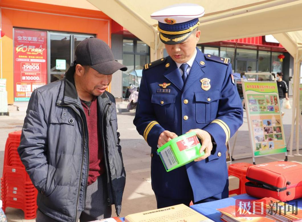 活动现场,消防监督员向群众发放消防科普折页和警示海报,向他们宣讲各类消防安全常识。活动现场气氛热烈,消防监督员拿起过滤式消防自救呼吸器、应急照明灯、灭火器等常见消防器材,逐一展开现场讲解。