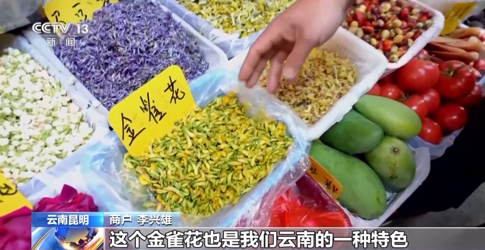 春日时节,市场里春意盎然。金雀花、玉荷花、紫藤花等摆满摊位,这些鲜花不是用来观赏的,而是云南独有的春日限定食材。