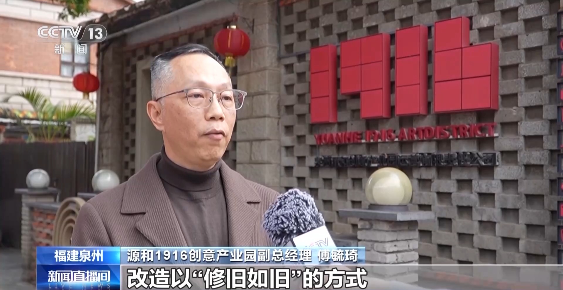 总台记者 阮思潼:在福建泉州源和1916创意产业园,随处都能感受到新旧时光交融带来的独特韵味。在这个产业园内,最引人瞩目的是一座高达二十多米的红砖大烟囱,它是旧蜜饯厂时期遗留下来的工业建筑,现在它的周围装点上了各式各样的创意装置。这里一些老工业厂房的墙面上,也画满了各种各样、不同颜色的卡通墙绘,也让这片斑驳的墙面焕发出了新的生机。
