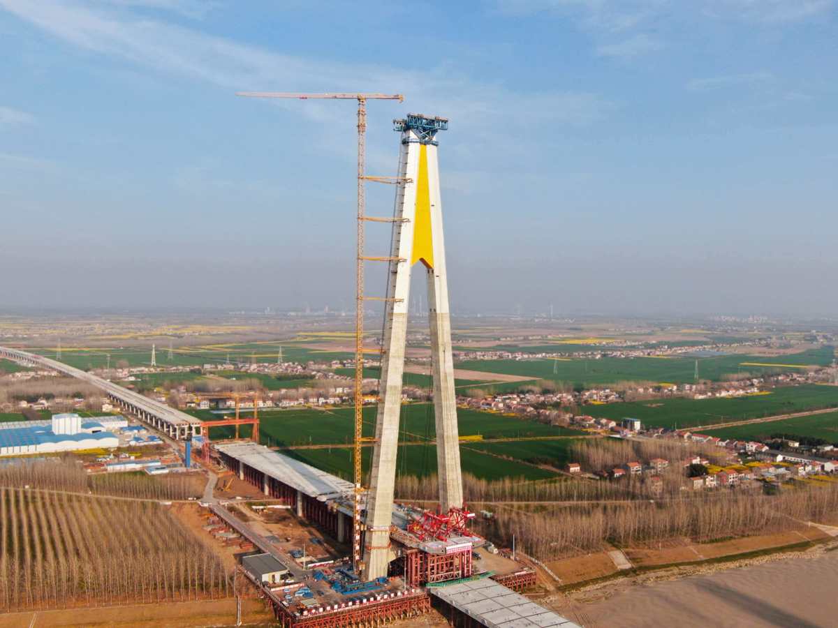 站在江陵县同心村江边远观大桥,262米高的主塔犹如利剑直入云端,塔尖黄色“楚服”造型格外醒目。主塔旁靠江边的主跨上稳稳搁着一片钢箱梁,由缆载吊机牵引。各种工程车进出,脚下的钢平台微微颤动。