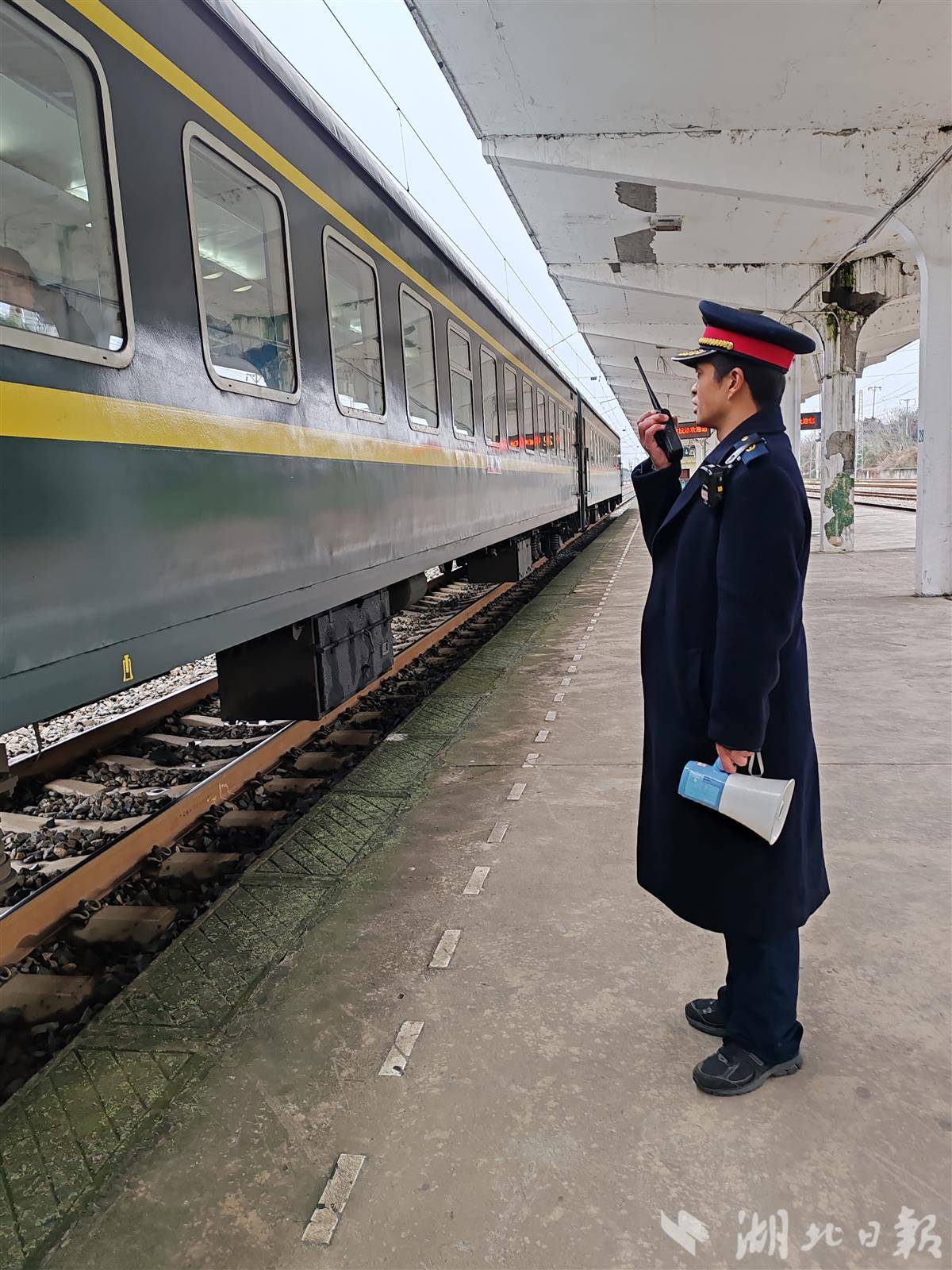 一列火车驶入枝城站,客运员王洪志在站台接车。
