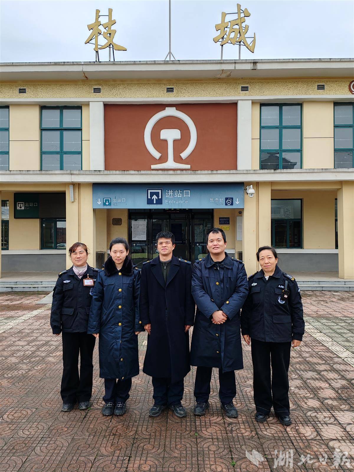枝城站客运5人组,左起分别是:张艳(安检员),贾乙(客运员),王洪志(客运员),陈俊逸(客运员),何绍芹(安检员)