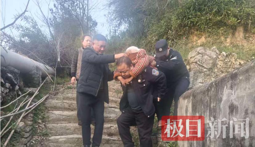 与此同时,民警查看询问伤情,在确认暂无骨折风险后,果断决定——俯身背起老人!蜿蜒小路,一步一步,民警小心翼翼将老人安全背至山下警车。