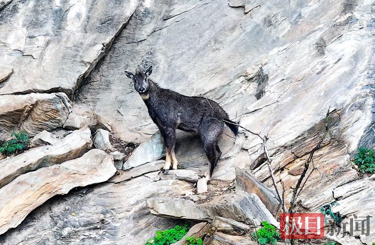 当天,多名过往司机惊喜地发现,在一处100多米高的峭壁上,俗称“四不像”的鬣羚竟在大白天现身。据当地村民介绍,他们白天最多一次看到过5只鬣羚同时在峭壁上活动。