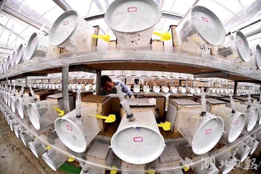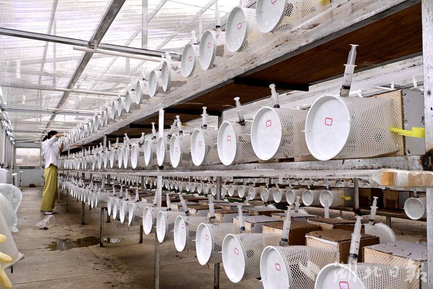 据基地副总经理万厚今介绍,胡蜂养殖的投资少、见效快、成本低,效益非常可观。正常的野外放养是以三个蜂王为一群,只需要在合适的地方挖一个小坑,盖上木板,上面搭一个简易的遮阳防雨的小棚子,成本非常低。刚开始头7天,稍微喂一点营养液。后面可以喂一点饲料。7天到半个月以后,基本上不需要每天去观察或者是投喂。与过去粗放模式不同,基地通过设施化改造、智能化调控、全程化管控,对蜂王交配、越冬复苏、筑巢产卵等核心环节实行精准管理,彻底改变了靠天养蜂的传统局面。