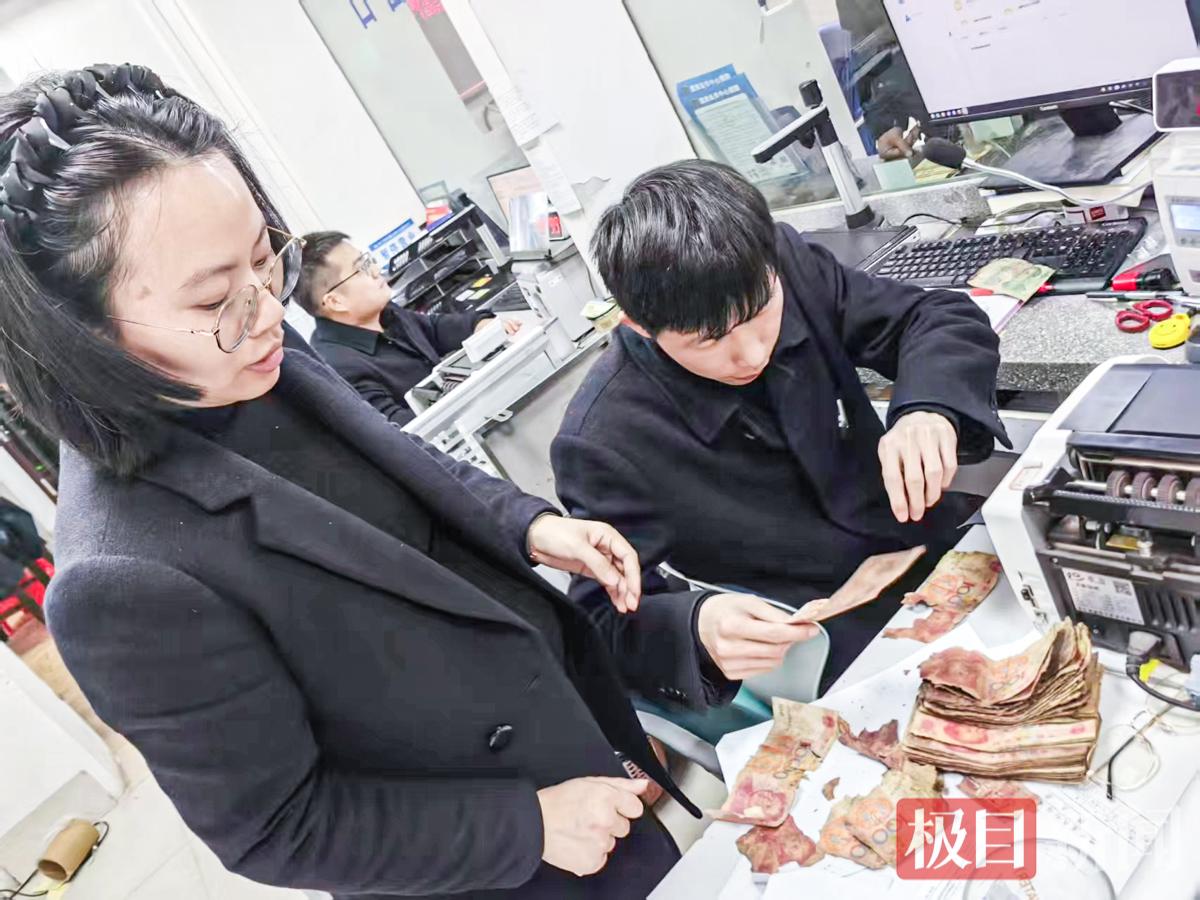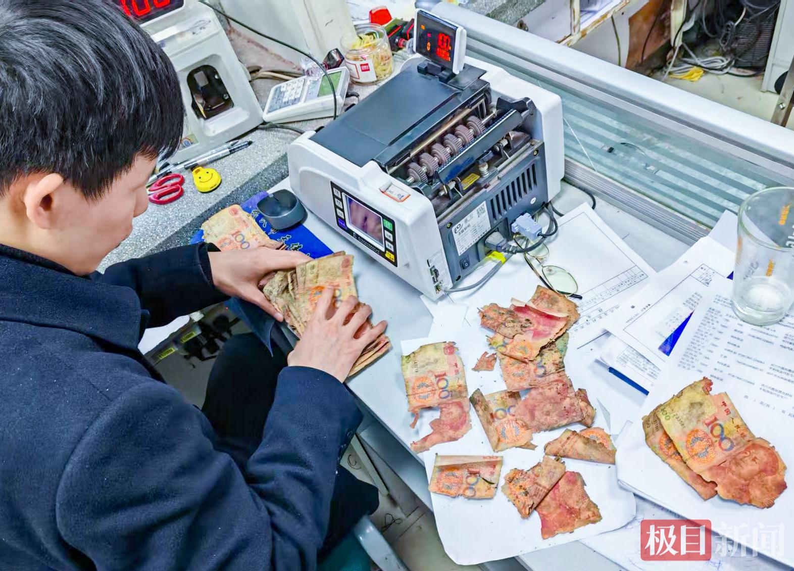 银行工作人员清理受损纸币。(通讯员供图)