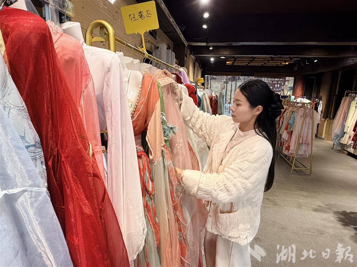 3月17日,武汉大雨,江夏里的石板路湿漉漉的,“天外飞仙”体验馆里,店主叶子正埋头整理衣架。她把春节期间穿过的厚款汉服一件件整理清洗,腾出位置挂上更轻薄的春装。