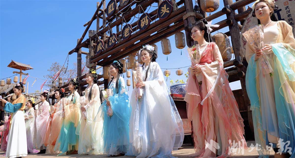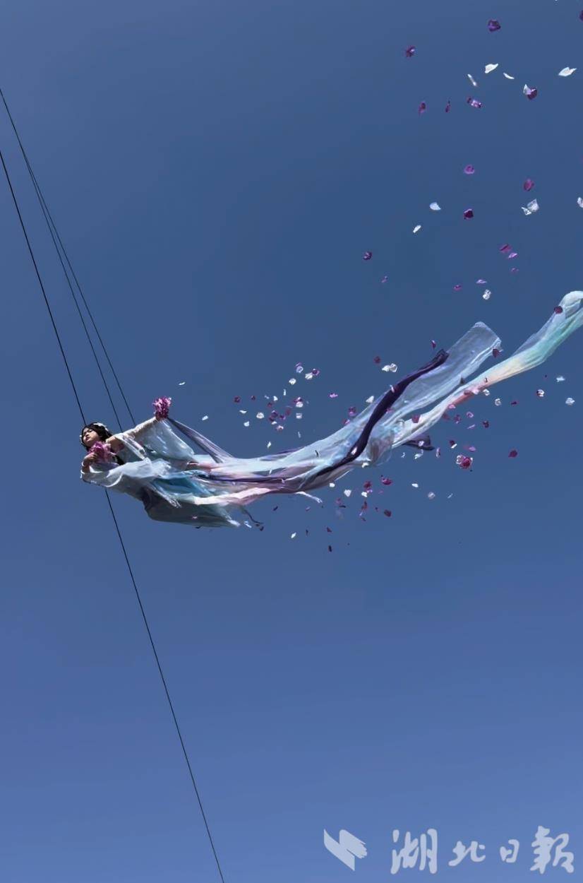 叶子做的“天外飞仙”,是传统汉服妆造结合吊威亚体验。游客穿上定制华服,由专业设备吊起,在湖面上空“飞行”,江夏里的古建筑、油菜花田、坡地梅花、桥上装点的樱花尽收眼底。