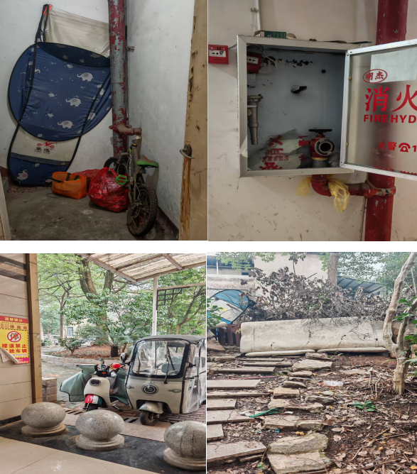 上榜理由:楼道堆放杂物;消火栓箱内水带缺失、破损,消防设施无法正常使用;楼道口违规停放电动自行车;公共区域环境卫生杂乱。