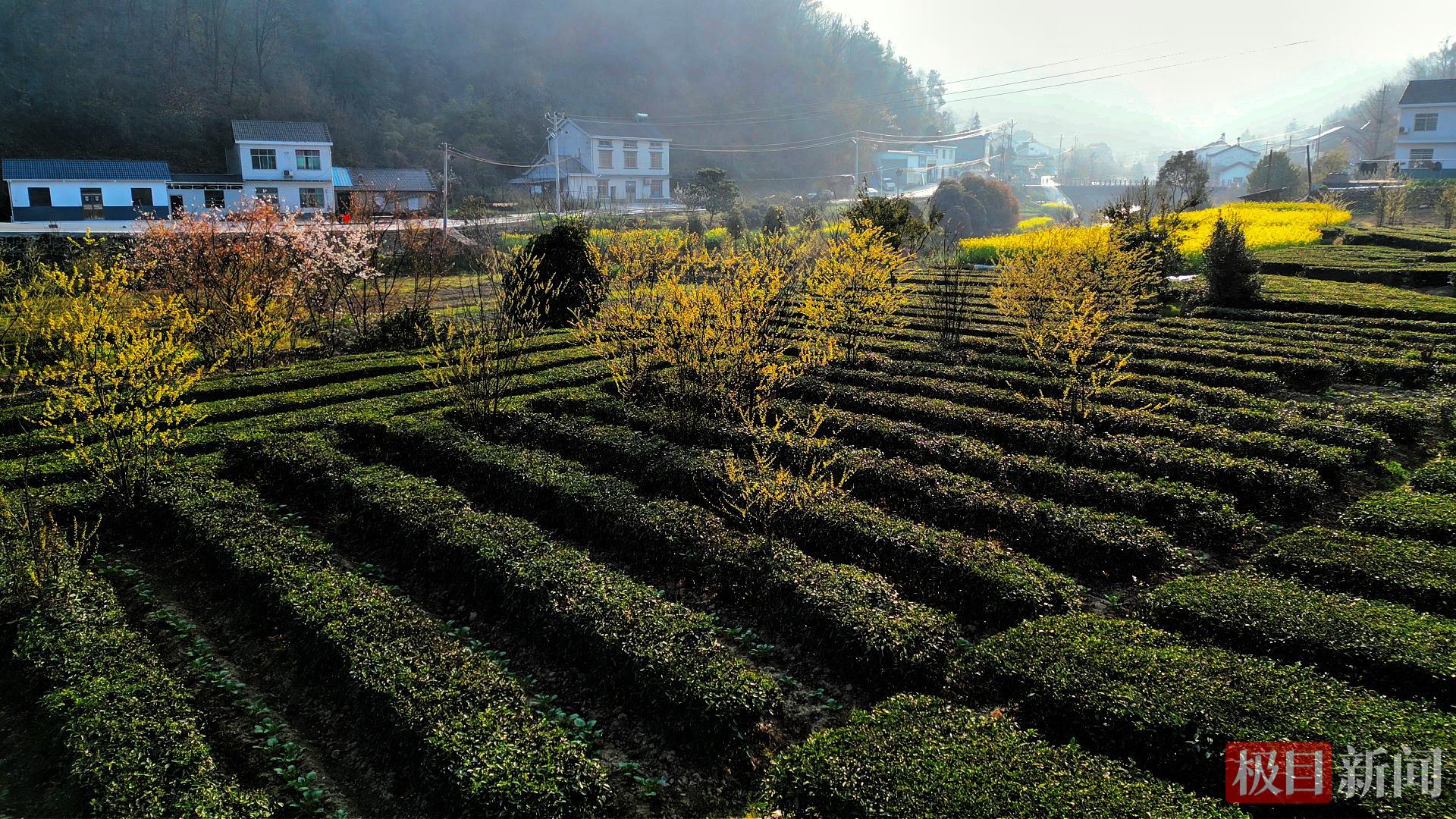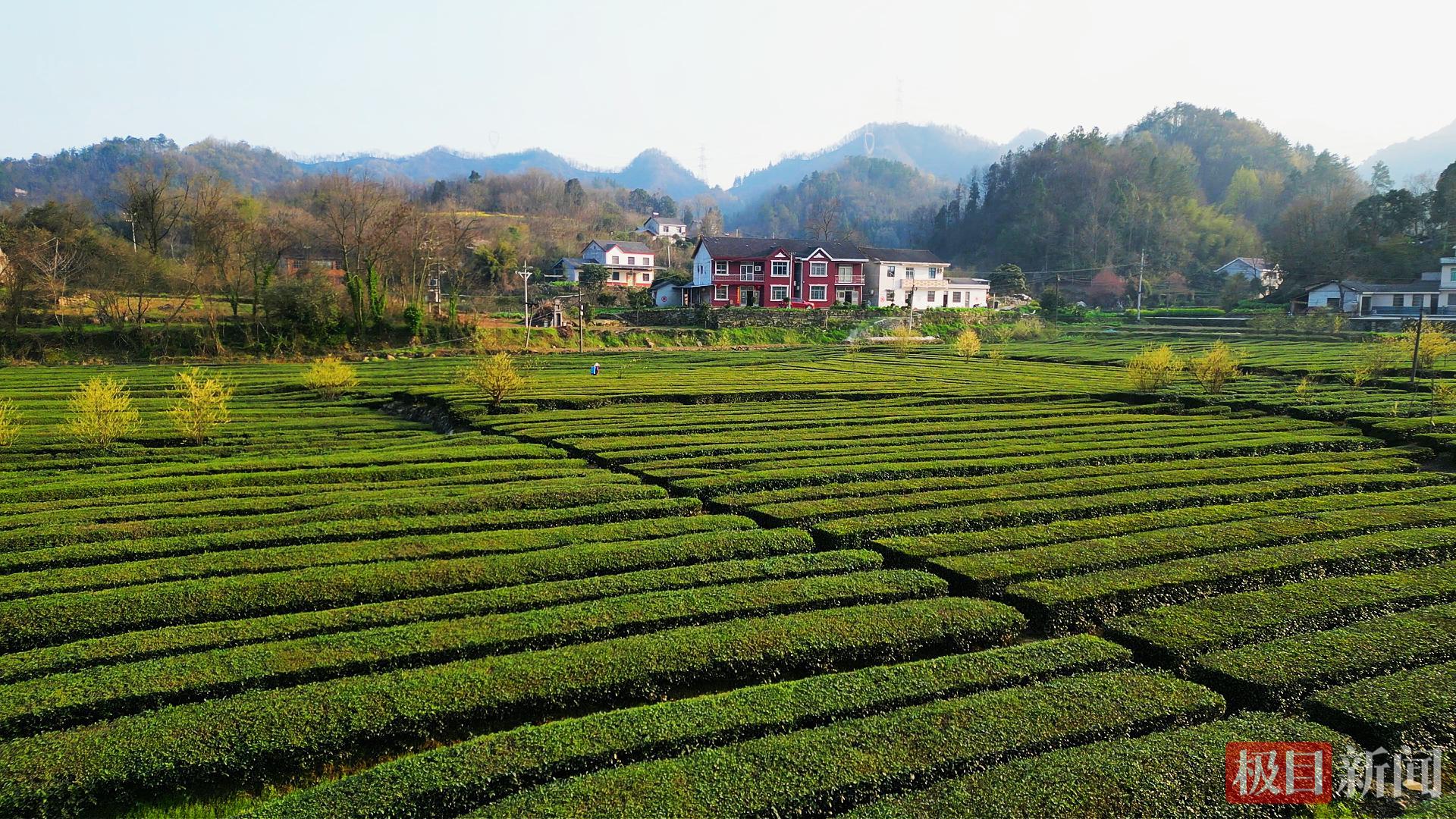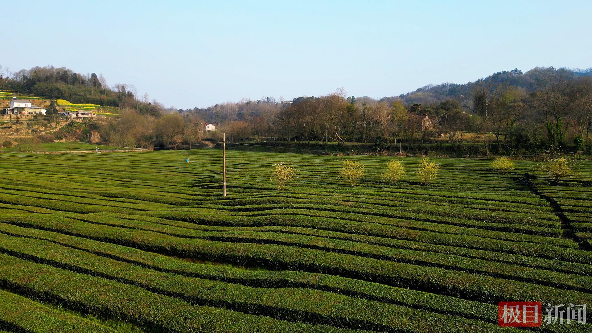 与山胡椒花海交相呼应的,是村内1500亩连片平坦的生态茶园。茶园地势平缓、视野开阔,成片的茶树整齐排列,如一块温润的绿毯铺展在山间,嫩绿的茶芽破土而出,鲜嫩饱满、色泽鲜亮,采茶人背着茶篓穿梭在整齐的茶行中,指尖轻捻、采摘嫩芽,忙碌的身影与茶园、花海相融,为这幅春日美景增添了几分灵动的烟火气息。