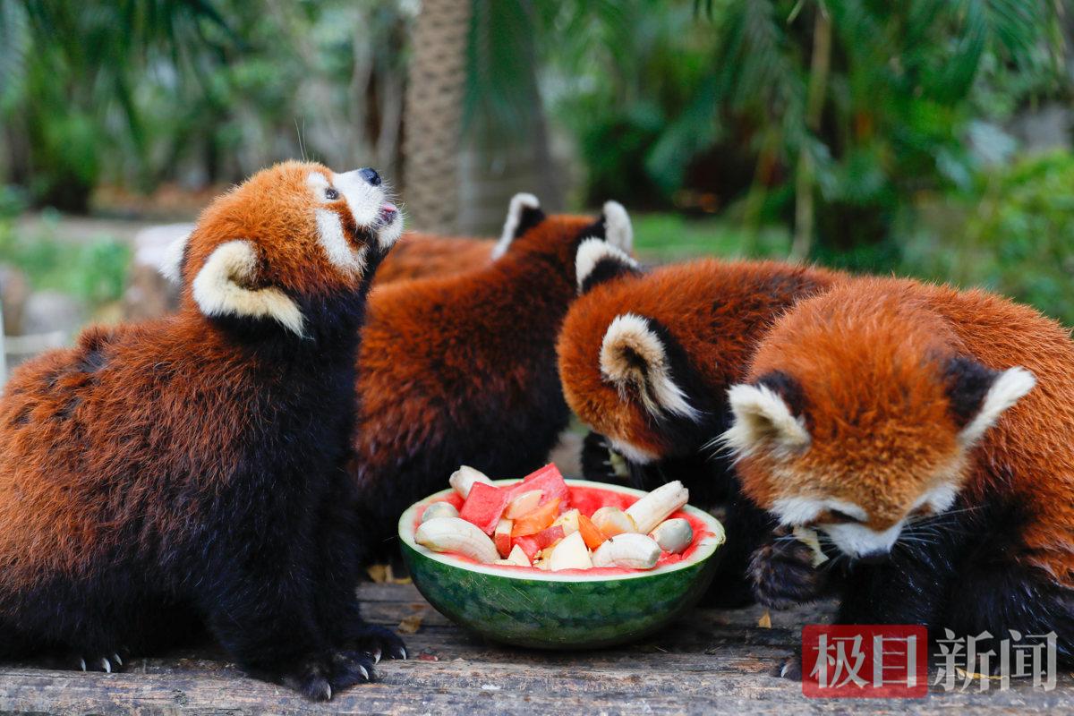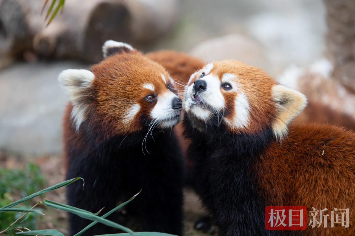 最受关注的当数刚入住的“小熊猫家族”。它们并不是“小的大熊猫”,小熊猫是独立的“小熊猫科”宝宝,与浣熊科亲缘更近。明明是熊科亲戚,却长着一副“猫系颜值”:一身红褐色皮毛像刚出炉的焦糖玛奇朵,脸上两坨标志性“腮红”自带害羞buff,蓬松的大尾巴比身体还长,跑起来像一团滚动的红毛球。四川人称它“九节狼”,正是因为这根有九个环纹的美丽尾巴。