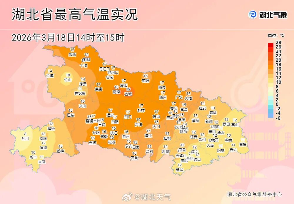 3月18日08时-3月19日08时,鄂西北零星小雨转阴天;其他地区小雨转阴天。最高气温恩施地区10~13℃、其他地区13~16℃,最低气温6~10℃,偏北风3到4级、阵风5到7级,夜间转2到3级。