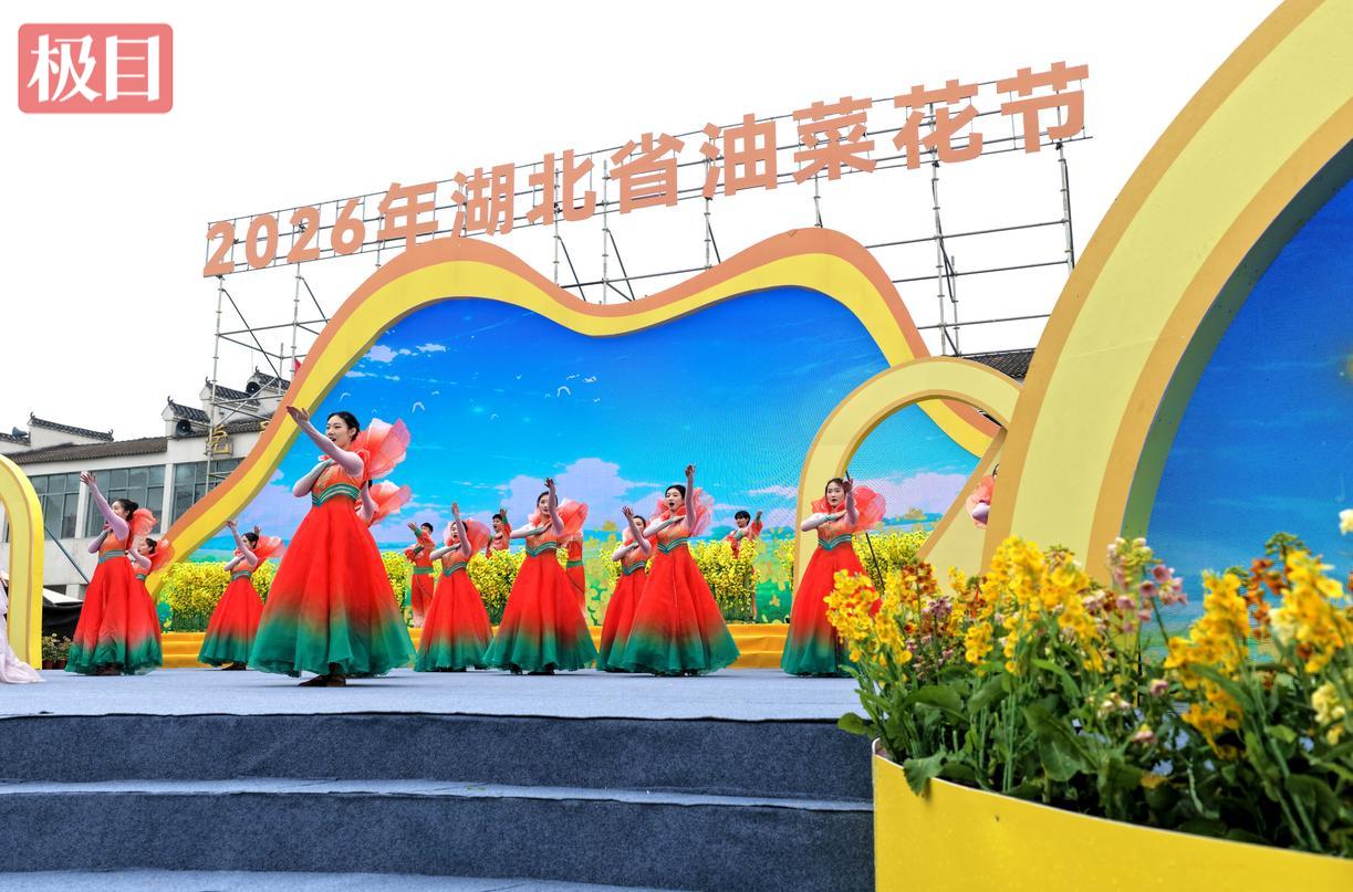 傅廷栋、李培武、朱蓓薇三位中国工程院院士亲临现场,为油菜产业高质量发展赋能;节会吉祥物“油宝”正式亮相,四片明黄花瓣搭配萌趣造型圈粉无数;人形机器人带来《花海律动》舞蹈秀,与演员穿梭互动、派发文创好礼,传统民俗与现代科技碰撞出别样火花。