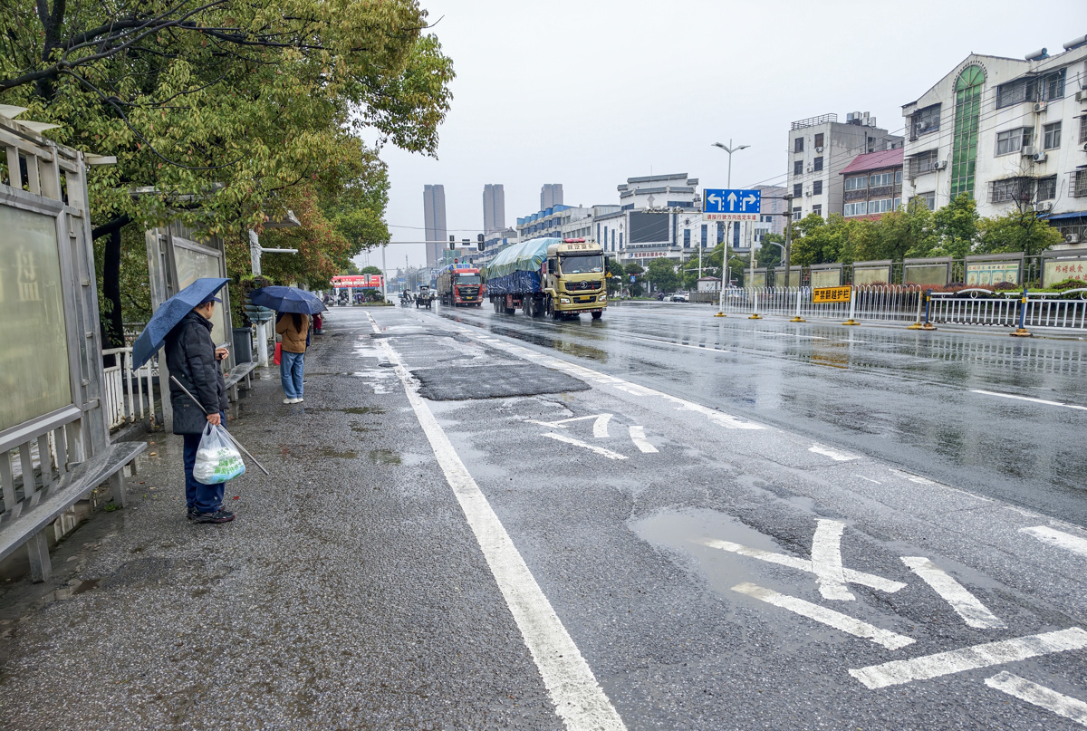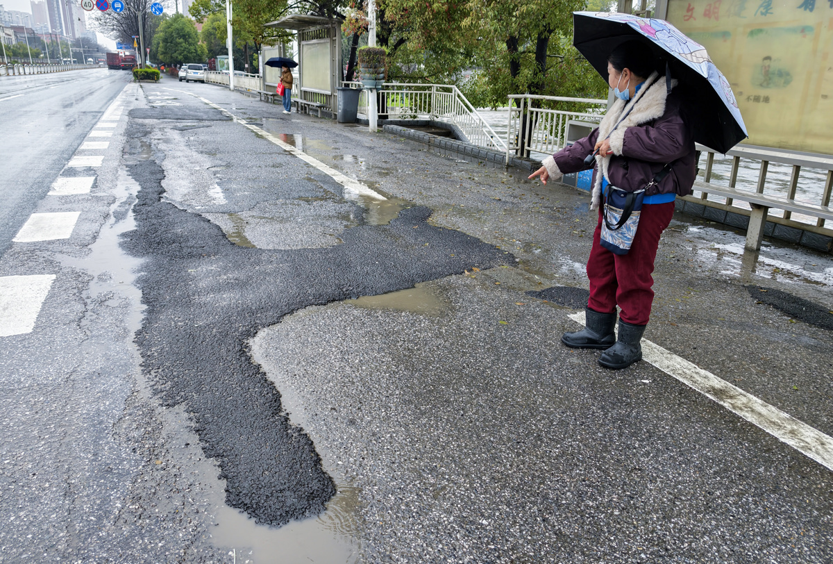 3月18日上午,新闻记者现场看到,事发公交站位于汉施公路东方城往谌家矶方向,进站路面上打的多处补丁非常明显。附近居民反映,汉施公路大货车通行频繁,路面受损情况较为常见。