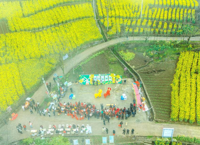 3月18日,游人在湖北省秭归县屈原镇北峰村观看特色民俗表演(无人机照片)。