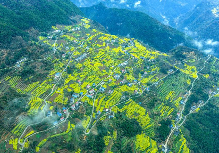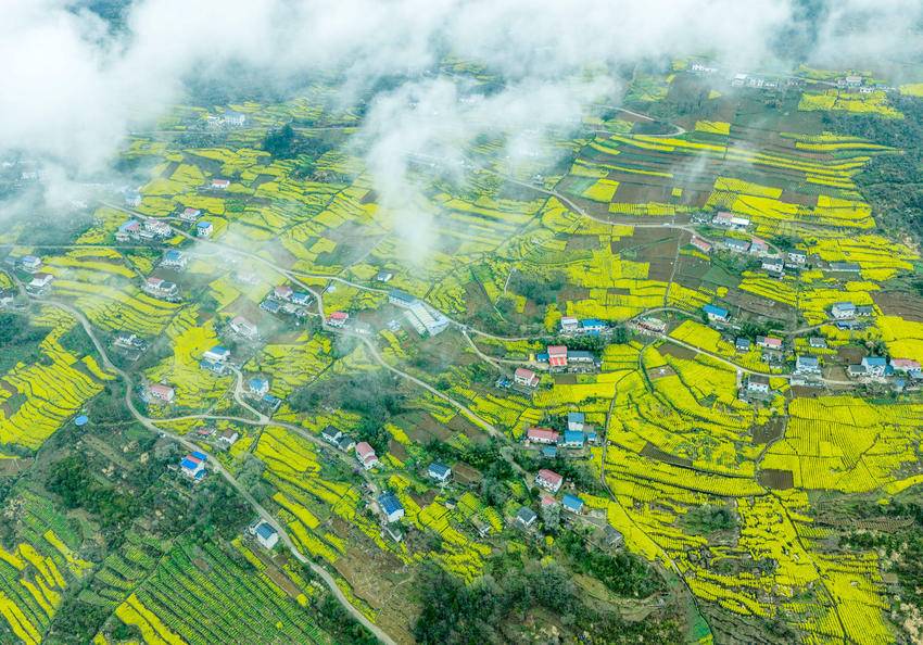 3月18日,在湖北省秭归县屈原镇北峰村拍摄的雨后油菜花海(无人机照片)。