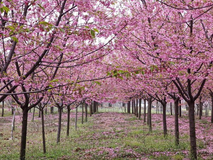 抬眼望去,满树繁花如云霞般绚烂,粉的、白的花朵交织在一起,在雨雾中若隐若现,恰似一幅晕染开来的水彩画。而树下,早已是落英缤纷,粉色的花瓣铺满了地面,如同给大地铺上了一层柔软的花毯。这一地残花与枝头的绚烂相互映衬,既有“落红不是无情物”的诗意,又有“花开堪折直须折”的热烈,将春日的生机与流转的时光完美融合。