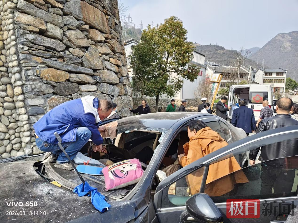 3月13日14时15分,郧西县羊尾镇板桥村李家棚广场附近,一声巨响打破午后平静——两车猛烈相撞,车身变形,车头凹陷,王女士被困车内,陷入昏迷。