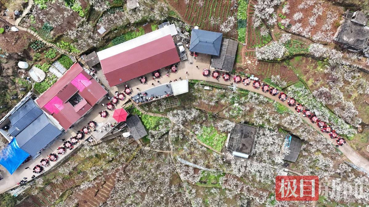 活动当天,向艳青照常打开手机拍视频。镜头里,花枝摇曳,花瓣似雪般飘落到桌上,乡亲们围坐吃饭,她对屏幕那头的粉丝说:“这就是我们高潮村的花海,欢迎大家来赏花!”