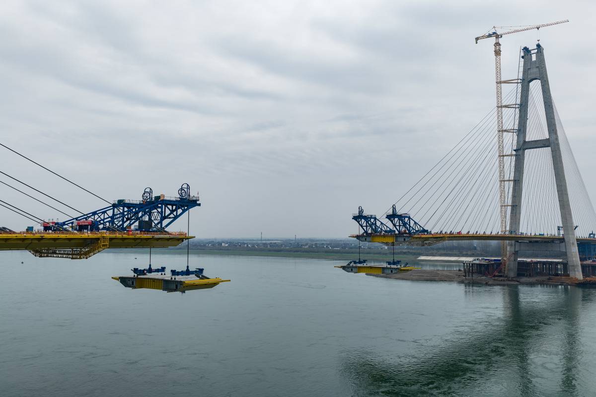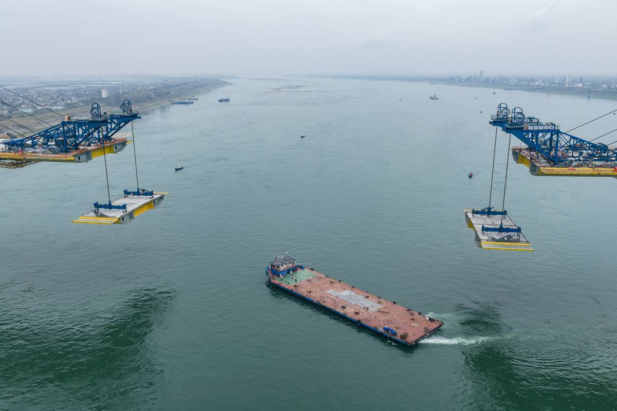 两岸钢箱梁同步吊装作业,枝江长江大桥桥面向着江心稳步延伸。