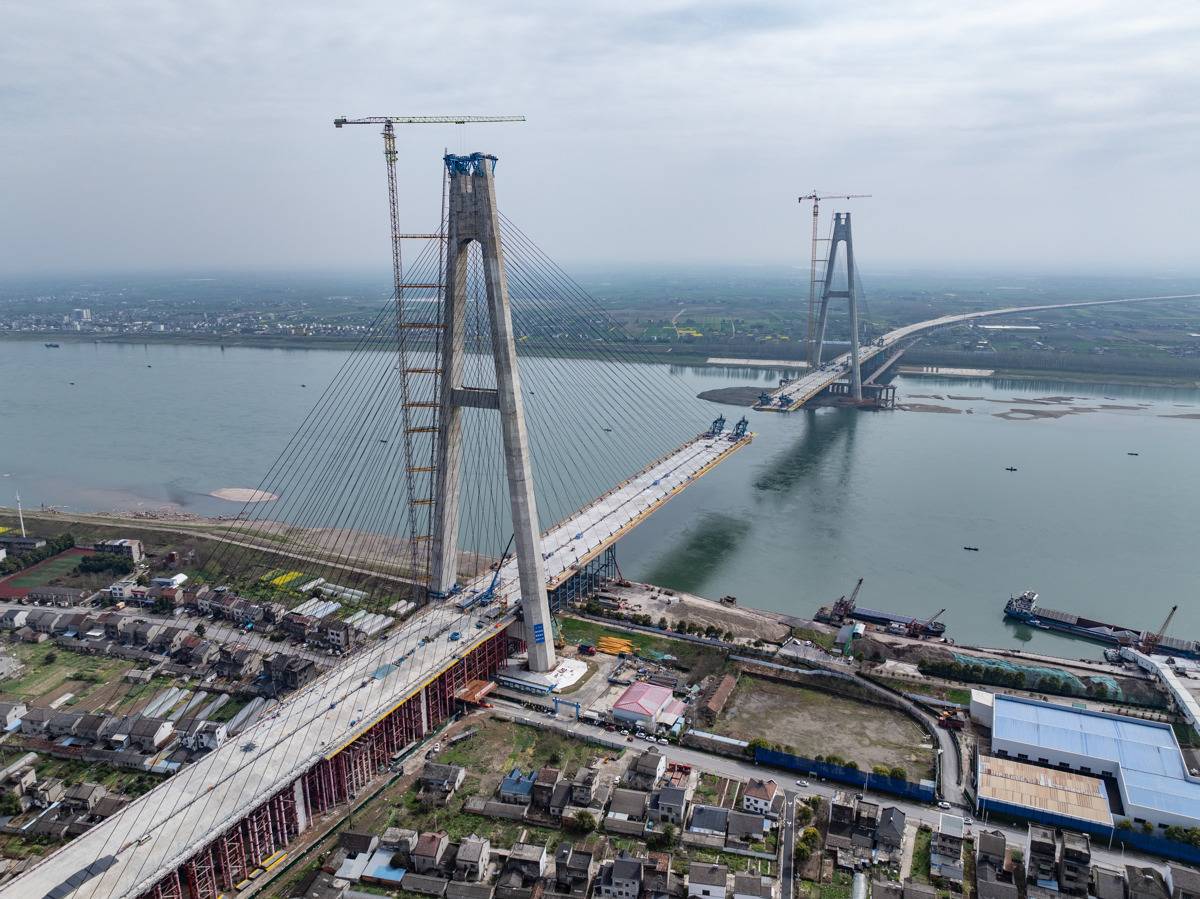 枝江长江大桥全长1549米,主跨890米,连接枝江市区与百里洲镇,是目前在建的世界跨径最大的钢—UHPC组合梁斜拉桥。