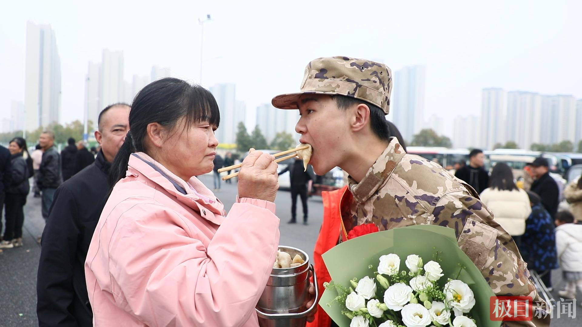 一句句誓言铿锵有力,一声声承诺振奋人心。新兵们集体庄严宣誓,铮铮誓言响彻现场,彰显着新时代青年投身军营、献身国防的坚定信念。家属代表满怀骄傲与期盼,寄语新兵扎根军营、淬炼成钢,用实干实绩回报党和人民的培养。 仪式落幕,温情涌动。离别时刻,最是动人。不少家长提着保温饭盒匆匆赶来,一碗碗热气腾腾的饺子冒着氤氲白气,承载着“上车饺子、平安出征”的质朴祝福,是家乡最温暖的饯行。
