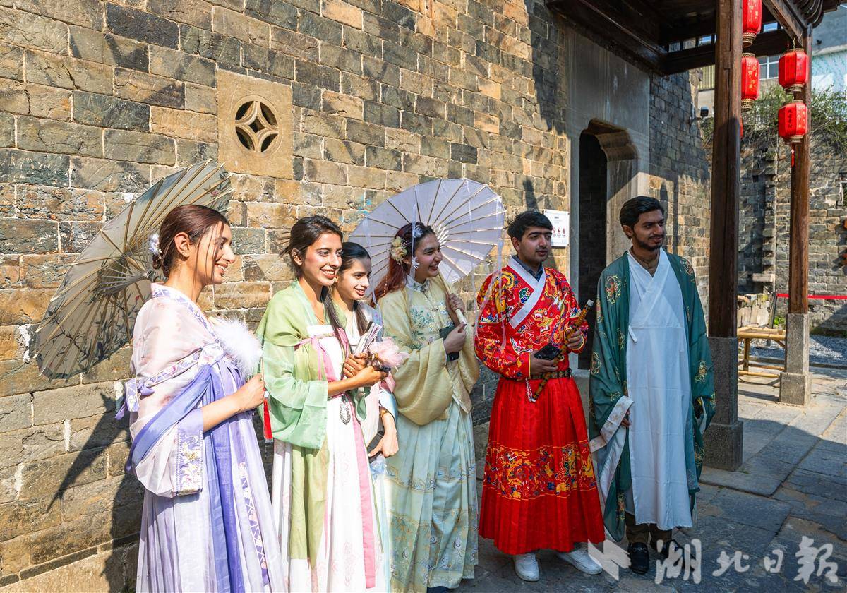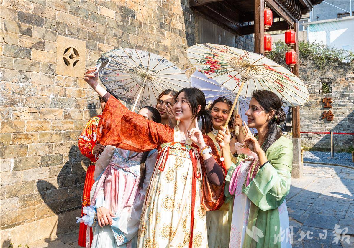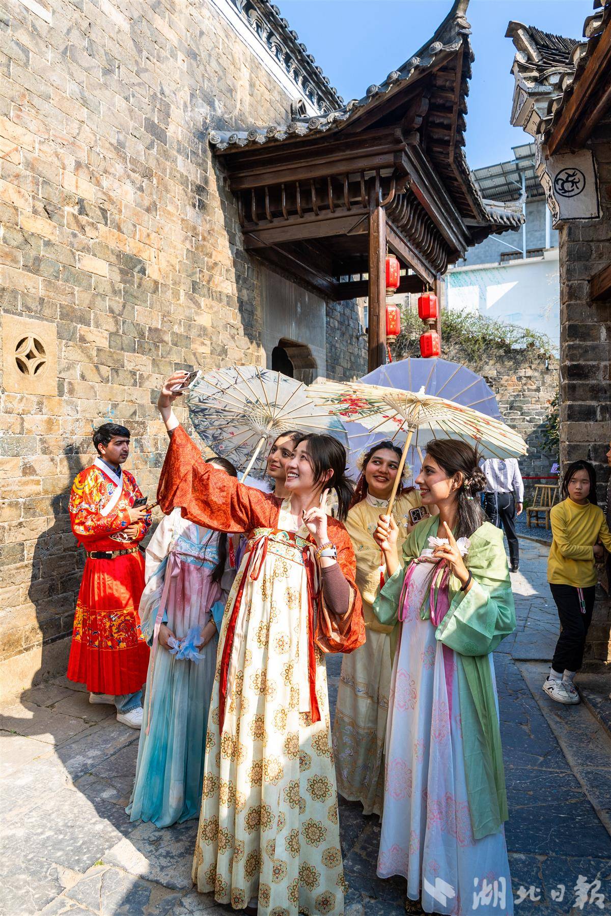 3月16日,大冶市上冯古村,来自湖北理工学院的留学生身着汉服游玩打卡。红灯笼点缀青瓦飞檐,古村处处洋溢着乡土气息。作为2026年全国 “四季村晚” 春节主场,上冯村依托古民居、古树等 “九古” 资源活化利用,坚持修旧如旧推进古村整治,成功创建国家4A级旅游景区。如今古村焕新重生、业态丰富,吸引众多游客前来观光游览,乡村旅游人气旺盛。(湖北日报全媒记者 薛婷 通讯员 何戈 实习生 别小彤 摄)