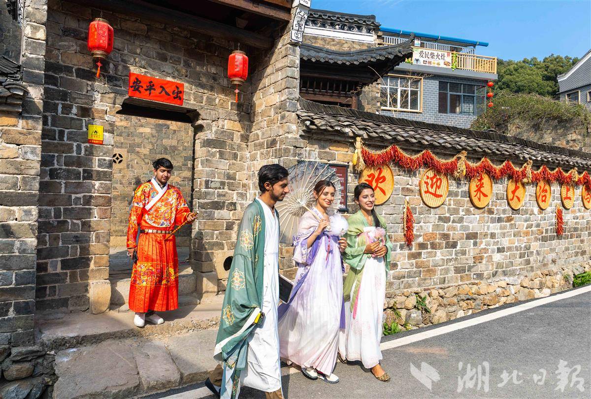 3月16日,大冶市上冯古村,来自湖北理工学院的留学生身着汉服游玩打卡。