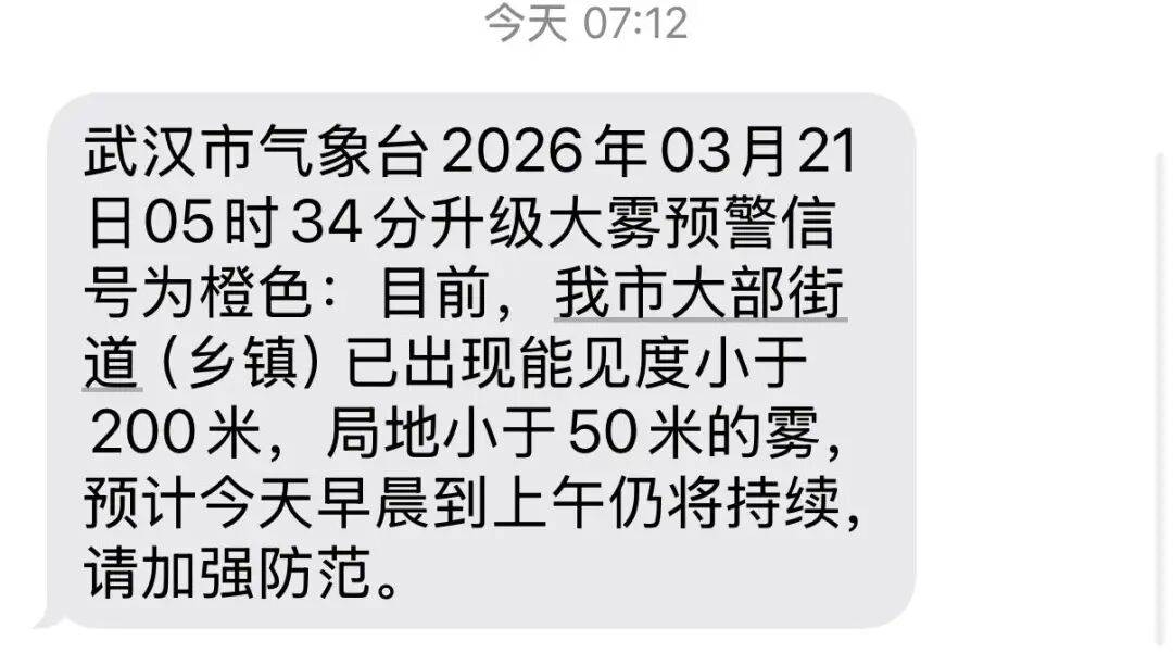 气象部门提醒:21日上午,省内襄阳、随州等地部分地区大雾天气仍将持续,请公众密切关注当地预警预报信息,提前规划出行路线,切实防范大雾天气对交通出行带来的不利影响,确保出行安全。