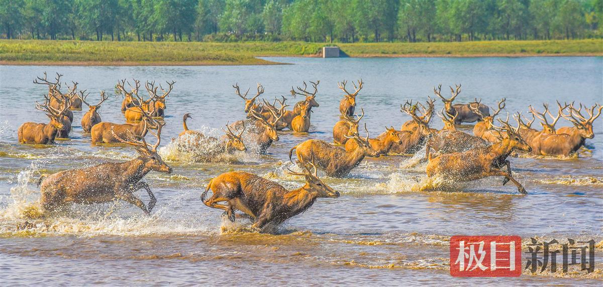 石首麋鹿国家级自然保护区,成群的麋鹿在湿地欢腾。(新闻记者 黄志刚 摄)