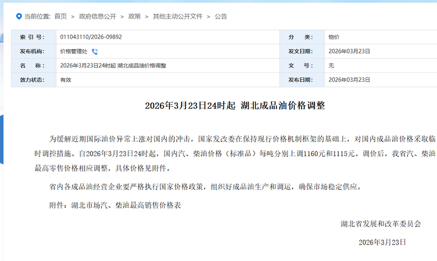 湖北日报讯(记者谢慧敏)我省此轮油价调整正式确定。从省发改委价格管理处获悉,为缓解近期国际油价异常上涨对国内的冲击,国家发改委在保持现行价格机制框架的基础上,对国内成品油价格采取临时调控措施,我省汽、柴油最高零售价格做相应调整,自3月23日24时起省内92号、95号汽油、0号柴油每升分别上调0.93元、1.00元、0.96元;调价后,92号、95号汽油每升分别涨至8.58元、9.18元,0号柴油每升涨至8.25元。