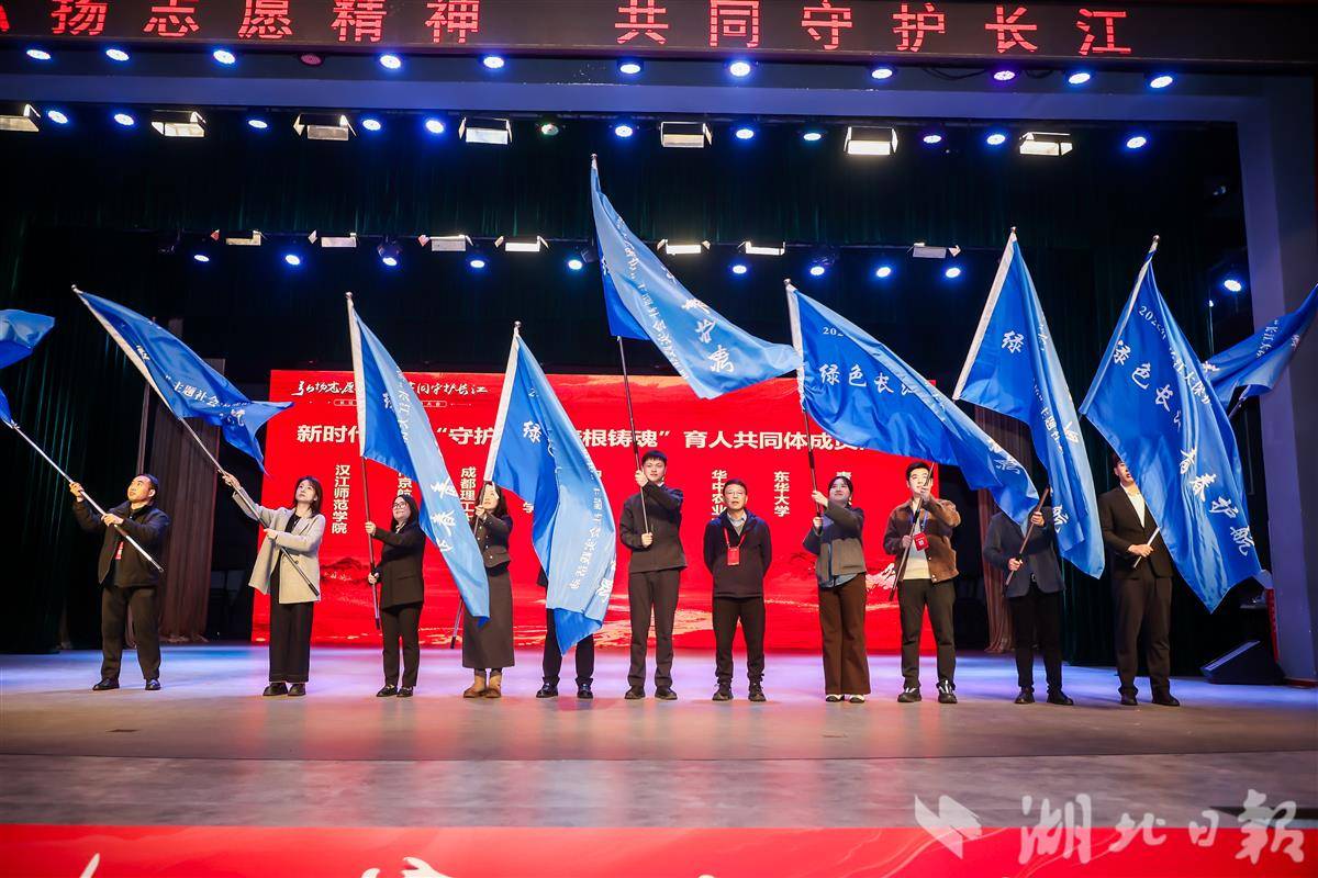 新时代高校“守护长江 培根铸魂”育人共同体成员单位高校社会实践团出征授旗仪式。(通讯员焦思勤 摄)