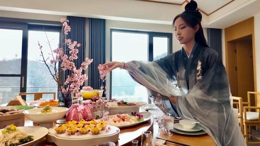 如今,像老杨这样吃上“生态饭”的村民不在少数。“今天接了两个团、7桌散客,200多号人,樱花季天天都这么旺!”“君山人家”老板来安平笑得爽朗。在“君山人家”农家乐庭院里,木桌和竹椅依花而设,阳光穿过花枝洒下碎金,游客围坐其间,欢声笑语与花瓣齐飞。主厨们以山野为厨、以樱花为料,精选散养土鸡、山间鲜笋、地头时蔬,搭配可食用樱花,匠心烹制樱花黄精鸡汤、樱花饼、樱花蒸肉等十余道春日限定菜品。鸡汤清润回甘,饼点酥香软糯,一口下去,是谷城水土的鲜,是古法烹饪的香,更是樱花入馔的雅。