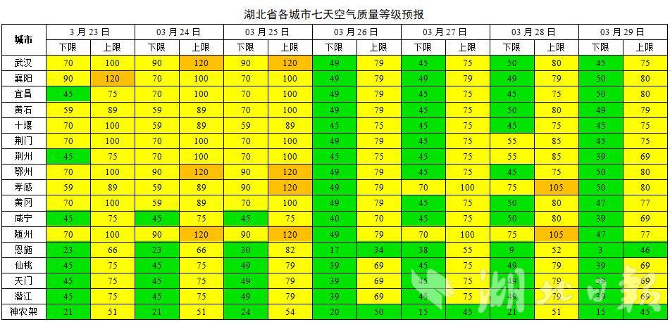 湖北日报讯(记者刘郸、通讯员李斌)3月23日,湖北省生态环境厅发布最新空气质量预测:预计本周(3月23日至29日),我省天气晴雨相间,空气质量以优良为主。