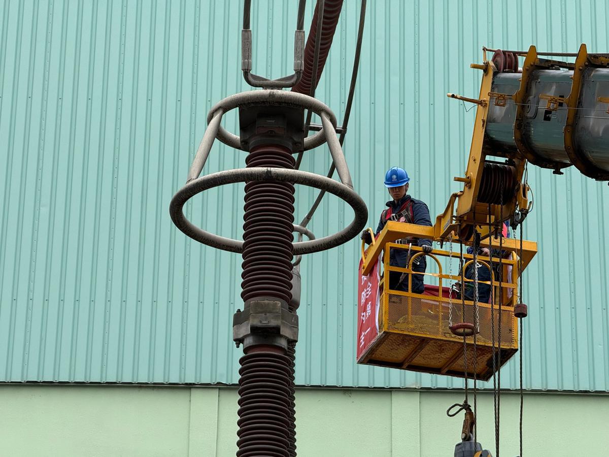 国网湖北直流公司检修人员在吊车上检查避雷器外观状态。曾宇 摄