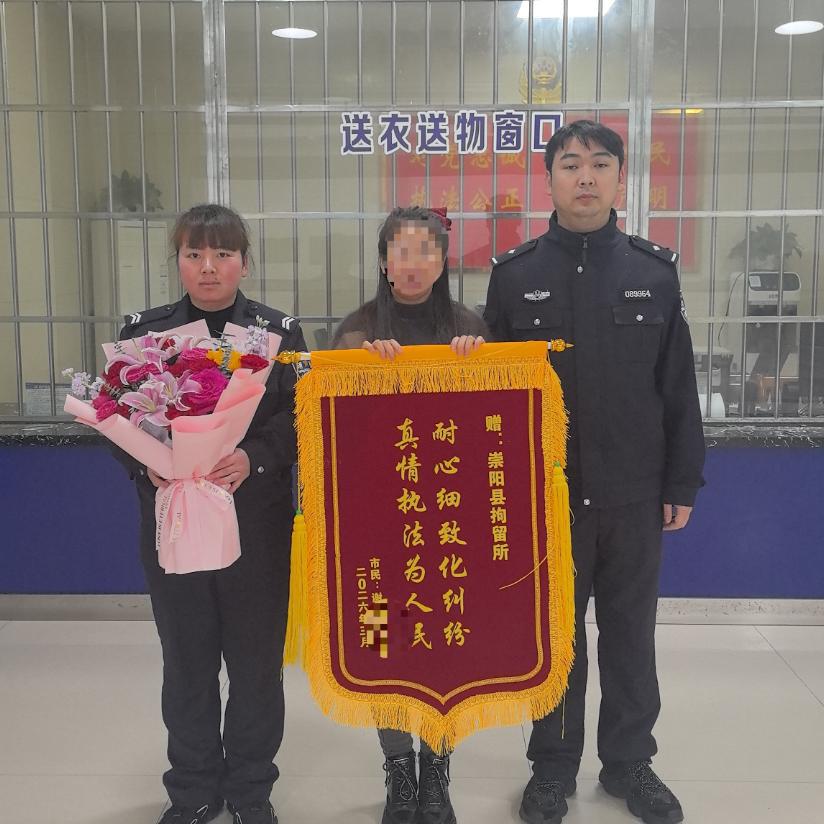 3月20日,在崇阳县拘留所接待大厅内,谢某将印有“耐心细致化纠纷 真情执法为人民”的锦旗及鲜花送到民辅警手中,对拘留所民辅警在其拘留期间耐心细致的调解工作与春风化雨般的教育感化表示由衷的感谢。