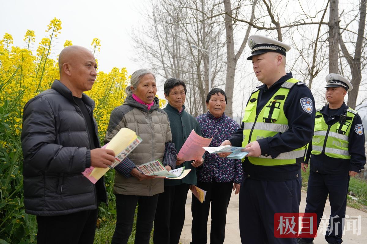 除了广场上的集中宣讲,民警们还在油菜花田旁的田间道路上,向村民们讲解面包车超员、三轮车违法载人等交通违法行为的危害性。“李大哥,您平时下地干活骑的三轮车,后斗可不能坐人啊,太危险了!”民警对村民李大哥说道。