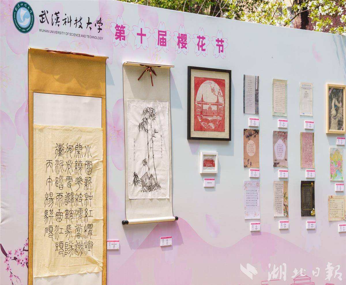 此外,节日现场还首设“樱墨丹青——美育作品展”,集中陈列本校学生的书画摄影作品。法学专业2402班的余金桂在观展后表示,这些传统艺术作品激发了她自己动手学习绘制丹青画的强烈兴趣。