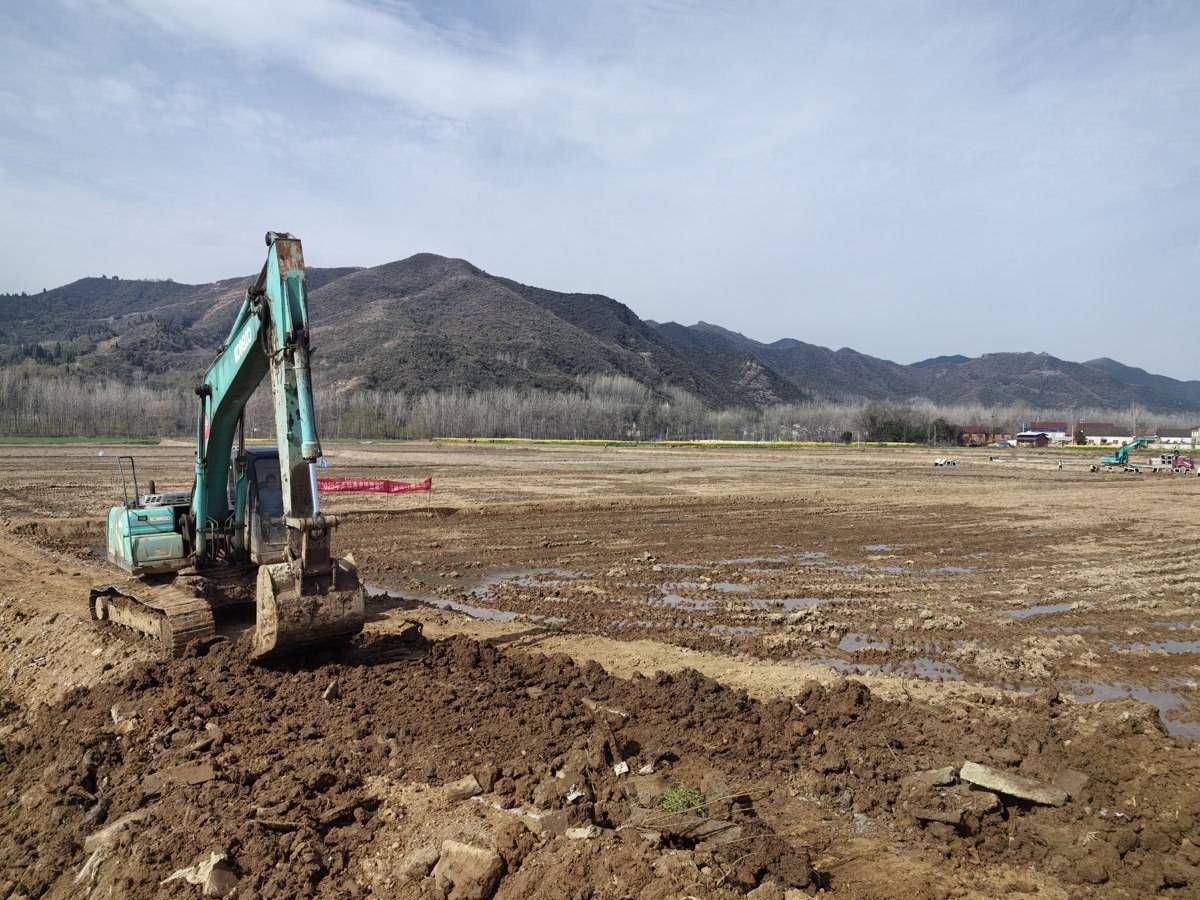 3月25日,春光明媚,在南漳县九集镇泗堵河村一组,挖掘机挥舞“铁臂”,推土机来回穿梭,原本高低错落、形状不一的“巴掌田”连成片、变成方。