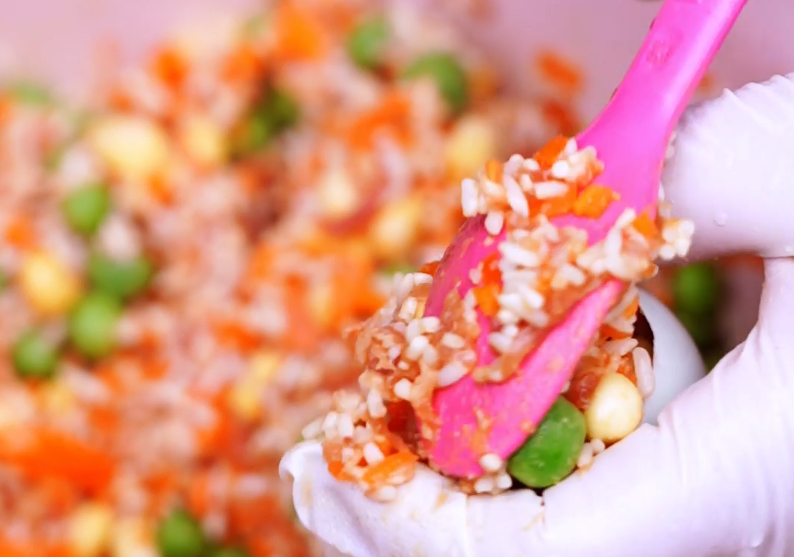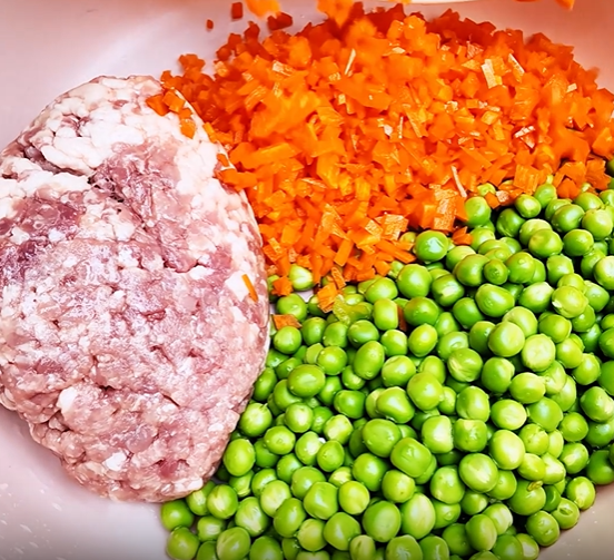 搭配肉馅、胡萝卜、青豆、玉米粒等丰富食材
