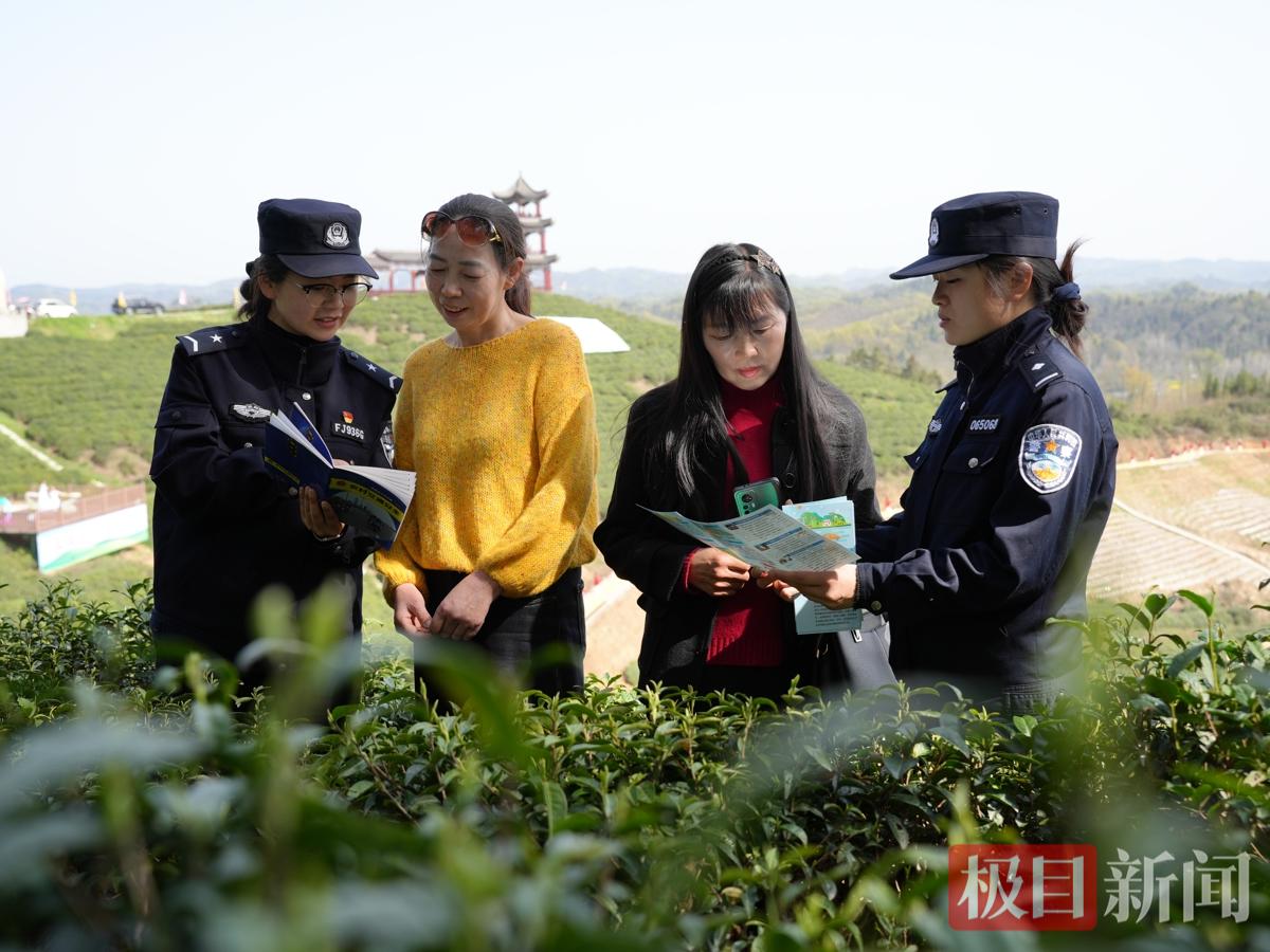 3月27日,湖北谷城县五山镇玉皇剑茶园举行开园节,万亩生态茶园新芽吐翠,茶香四溢。为保障活动期间群众出行安全,五山派出所组织警力深入茶园现场进行安保,同步开展农村道路交通安全宣传和防范电信诈骗知识普及,为群众送上“安全大礼包”。