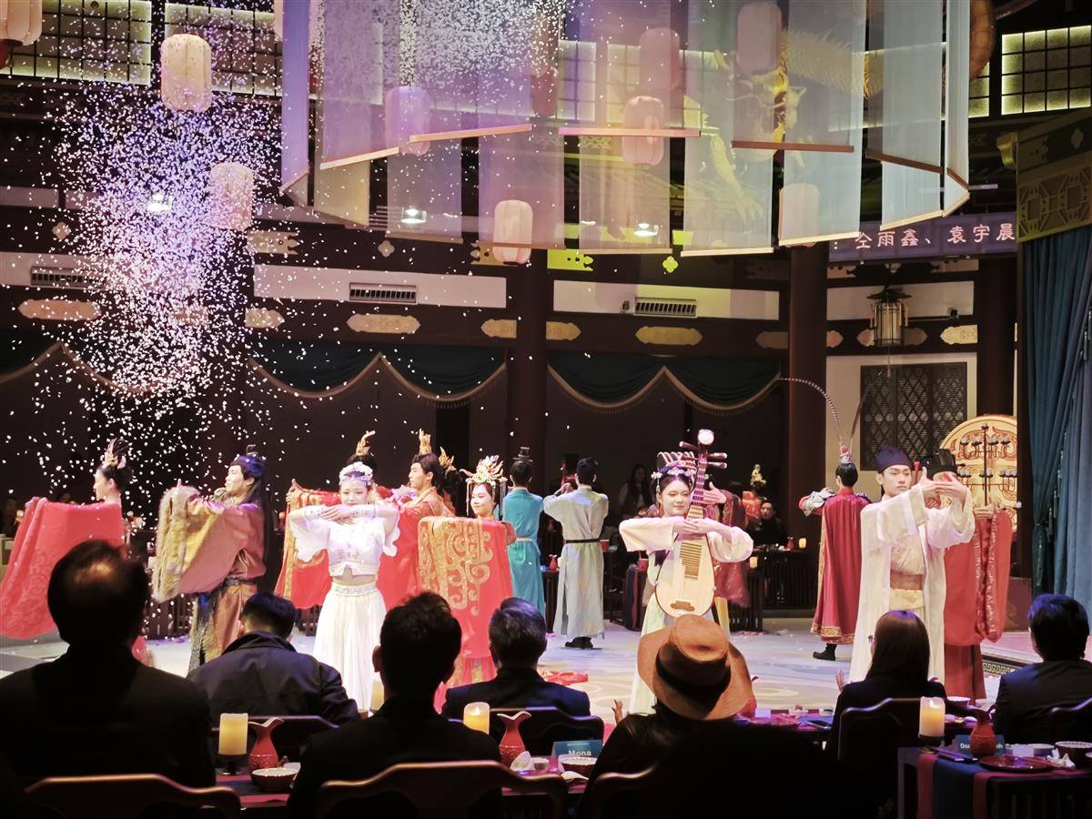 夜幕降临,嘉宾们拾级登上龟山知音殿,在《三国群芳宴》沉浸式餐饮秀中品鉴荆楚美食;最后乘船夜游长江,远眺两江四岸,“龟蛇锁大江”的壮阔气象引得众人纷纷举起手机拍照留念。