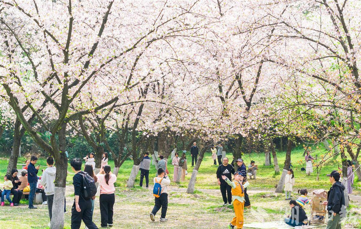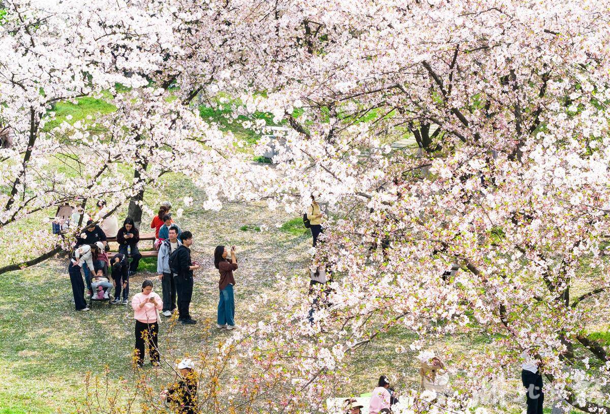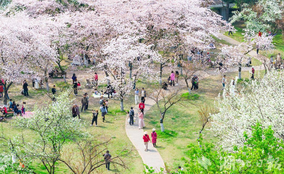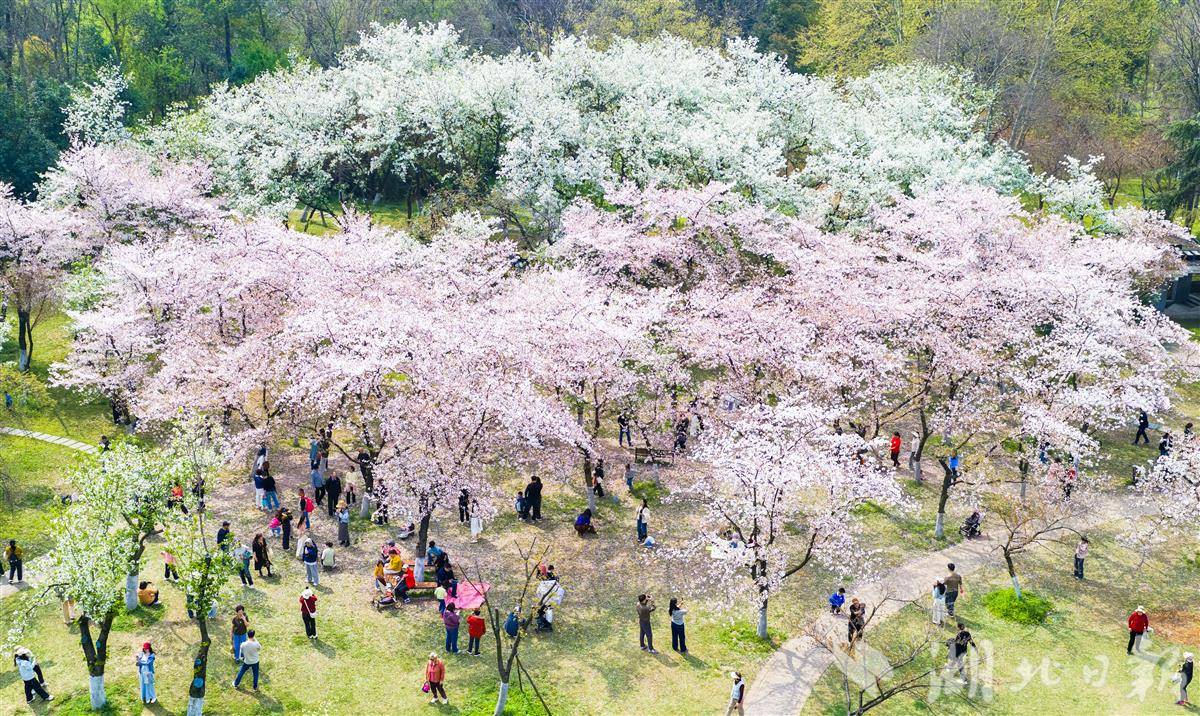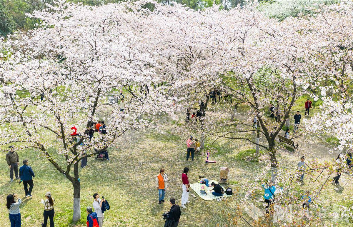 3月28日,武汉青山公园2万平方米樱花竞相盛放,粉白花海蔚为壮观,市民游客樱花树下花式打卡,乐享春光。