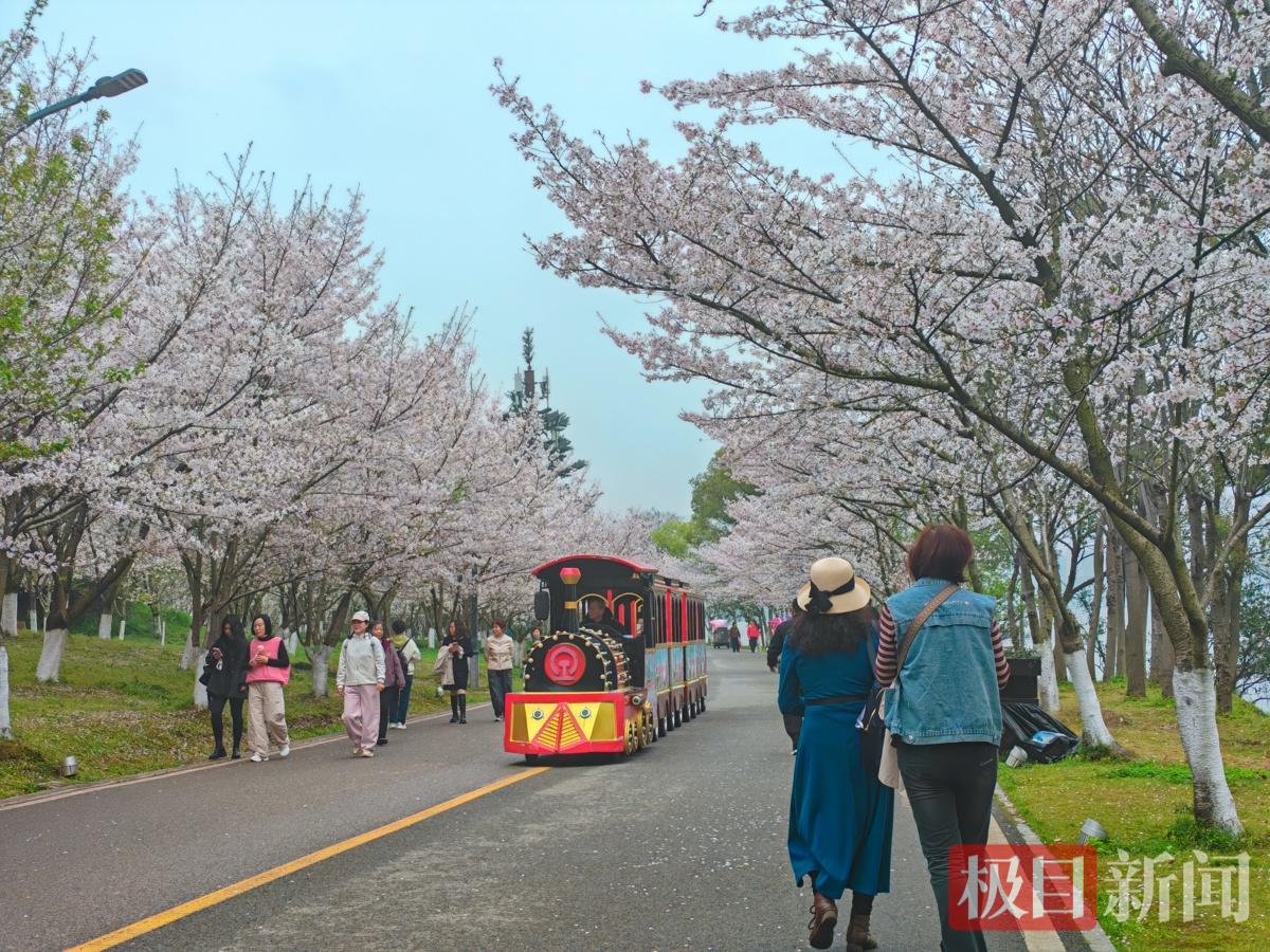 春日盛景不负期待,团城山公园樱花大道成为全城焦点。数百米樱花长廊繁花似锦,粉白花瓣随风轻舞,织就一片唯美“香雪海”。园内游人如织、笑意盎然,游客们或驻足定格花间美景,或漫步畅享春日惬意,一列小车穿行于粉霞蔽日的花海中,宛若泛舟花潮,绘就一幅灵动的春日画卷。