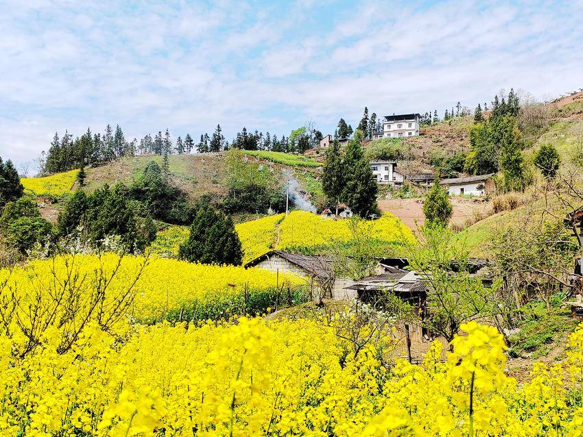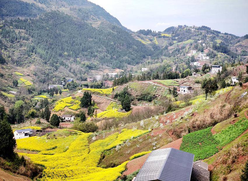 站在巫峡口村的山岗上远眺,层层叠叠的梯田里,金黄的油菜花如浪涛般铺展起伏,与洁白如雪的梨花交相辉映,点缀在青黛色的群山之间。蓝天白云下,白墙黛瓦的民居错落有致,炊烟袅袅升起,与漫山遍野的繁花相映成趣,勾勒出峡江地区独有的田园诗意。